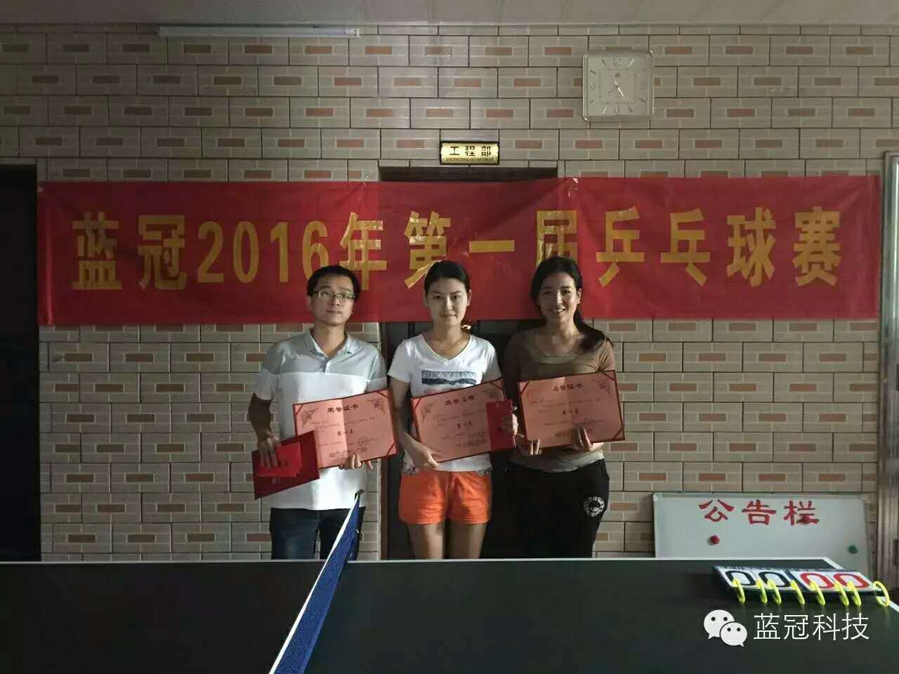 迎新辭舊,藍(lán)冠第一屆乒乓球賽2016年1月15日-17日在藍(lán)冠公司隆重舉行,經(jīng)過(guò)幾輪精彩激烈的對(duì)戰(zhàn),陳家軍、鄧琳、苗瓊分別獲得單打、雙打各項(xiàng)冠軍。